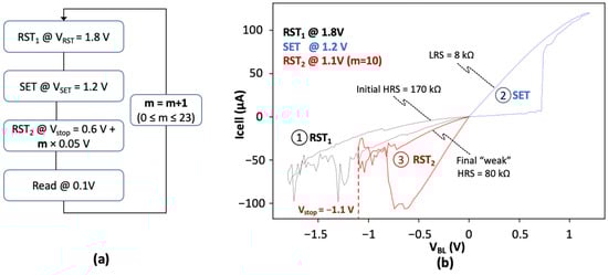 In this approach, OxRAM conductance modulation is obtained by controlling the maximum RST voltage. To program the memory cells and precisely track the HRS resistance change, 1 ms DC staircase voltage sweeps are used. A strict measurement protocol, depicted in Figure 6a, is used. Memory cells are first RST (RST1) at 1.8 V to start from a fresh HRS state. The RST operation is followed by a SET operation to reach the LRS state. After that, a second RST operation (RST2) with a variable maximum voltage Vstop is applied across the cells. Vstop ranges from 0.6 V to 1.75 V and increases by a 0.05 V step in each iteration, resulting is 24 different maximum Vstop voltages. For each iteration, the HRS resistance change is measured during a READ operation at 0.1 V. In Figure 6b, I–V characteristics are presented for a single cell located in the center of the elementary memory array (this is an arbitrary choice as no significant behavior changes have been reported according to the cell position in the array during RST end SET operations). I–V curves are obtained after applying the above-mentioned RST1-SET-RST2 programming sequence with an arbitrary value of Vstop = 1.1 V. We can see that the cell starts from an intermediate RST state before the first RST1 operation, which results in a narrow hysteresis (black curve 1). From the resulting initial HRS state (170 kΩ), a SET operation (blue curve 2) brings the cell in the LRS state (8 kΩ). Finally, a “weak” RST operation, with Vstop = 1.1 V is applied to bring back the cell in an intermediate final HRS state (red curve 3). Indeed, as Vstop is clamped to 1.1 V, the RST process is not fully completed, leading to an intermediate HRS resistance level (80 kΩ). Note that no compliance current is set during the SET operation to only consider the impact of a variable maximum RST voltage on the final HRS resistance.