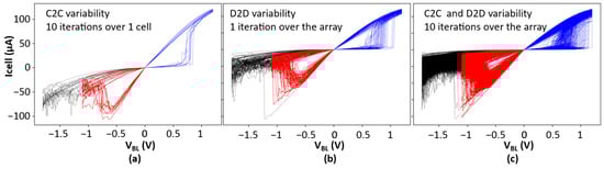 Results presented in Figure 6b are actually impacted by variability. C2C variability is clearly visible in Figure 7a where the programming sequence is repeated 10 times for an isolated cell (10 I–V hysteresis superimposed for Vstop = 1.1 V). In Figure 7b, D2D variability is demonstrated by applying the programming sequence one time to each cell of the memory array (49 I–V hysteresis superimposed for Vstop = 1.1 V). In Figure 7c, both C2C and D2D variabilities are captured after applying the programming sequence 10 times to the whole memory array.