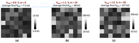 D2D variability is confirmed in Figure 8a–c bitmaps, extracted after RST2 operation for 3 different Vstop values (0.6 V, 1.1 V, and 2 V). Resistance values are represented by a color gradient from white (for the highest resistance values) to black (for the lowest resistance values). For Vstop = 0.6 V, the resistance window is [5.8–13 kΩ], with an average value of 7.5 kΩ. For Vstop = 1.1 V, the resistance window increases to [30–180 kΩ], with an average value of 88 kΩ. The resistance window is even more increased for higher Vstop values: the deeper we enter the HRS state, the higher the variability [27]. For Vstop = 1.6 V, a resistance window of [92–496 kΩ] is measured, with an average value of 237 kΩ.
