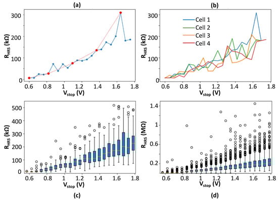 The evolution of the HRS resistance versus Vstop is presented in Figure 9a (Vstop ranging from 0.6 V to 1.75 V). We can see that RHRS evolution is not a monotonically increasing function of Vstop and shows some resistance drops (blue curve). However, if we consider a subset of the measurements (dot point of the red dashed curve), a monotonically increasing function can be obtained. In Figure 9b, the non-monotonic evolution of RHRS versus Vstop is confirmed for 5 different cells of the array.