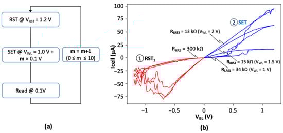 Another approach to achieve conductance modulation is to change the compliance current (IC) during the SET operation. Indeed, it has been demonstrated that the final cell resistance is a function of the maximal current allowed through the cell [29,30]. In the considered 1T-1R configuration, the SET current can be controlled by varying the voltage applied to the gate of the transistor, referred to as VWL (see Figure 1b). The measurement protocol is depicted in Figure 10a. Memory cells are first RST to start from a fresh HRS state. The RST operation is followed by a SET operation with a variable VWL voltage (“weak” SET) to reach the LRS state. VWL ranges from 1 V to 2 V and increase by a 0.1 V step in each iteration, resulting in 11 different VWL voltages (‘m’ ranging from 0 to 10). For each iteration, the LRS resistance change is measured during a READ operation at 0.1 V. Figure 10b shows the impact of 3 different VWL voltages (1 V, 1.5 V, and 2 V) on an isolated OxRAM cell. When VWL increases, the maximum current allowed through the cell increases, resulting in 3 different LRS levels (13 kΩ, 15 kΩ, and 34 kΩ), whereas the HRS resistance remains in the same range (approximately 300 kΩ).
