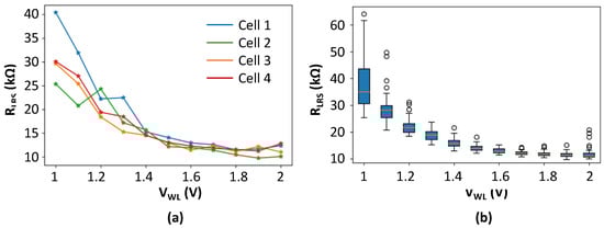 A statistical analysis of the LRS resistance distribution was also conducted. The measurement protocol of Figure 10a is applied to each cell of the 7 × 7 memory array to catch the D2D variability. Figure 11b shows a box plot representation of RLRS versus VWL voltage for all the memory array cells (49 measurements for each VWL step). We can observe that the higher the select transistor gate voltage, the lower the resistance after SET. Moreover, when the maximal allowed current decreases, the resistance values are more spread. Conversely, when the current limitation is high, all the cells are correctly SET, resulting in tight distributions [31]. A region of resistance variation has been identified (between 12.5 kΩ and 40 kΩ, see Figure 11a,b) where the conductance modulation in the LRS state can be exploited. Beyond this resistance range, the resistance variation slope is too important to consider conductance modulation.
