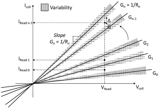 At the OxRAM device level, the conductance modulation strategy can be seen as a segmentation of the I–V plane by several I–V characteristics, as shown in Figure 12. For clarity, only eight different characteristics are considered. Each characteristic is associated with a single conductance resistance state and has a slope of Gx = 1/Rx, where x is the number of HRS/LRS states ranging from 0 to n. The precision required in the conductance modulation operation is not only limited by the programming operation; it is also necessary to develop an accurate and robust READ mechanism. The READ operation is typically implemented by applying a low bit line voltage to the memory cell select transistor (VRead), and resulting currents (I0 to In) are sensed to reflect the memory cell conductance value [32]. Although multiple resistance levels can be easily obtained using the above-mentioned programming methods (i.e., RST voltage and SET current control), the successful implementation of a reliable conductance modulation scheme mainly depends on the ability to precisely control the conductance margin between two conductance levels. Indeed, various factors, including variability in the first place, can degrade the conductance margin and eventually lead to I–V characteristic overlaps. In order to take into account the variability of the n resistance states, the conductance margin ΔG is represented in Figure 12 by the shaded area encompassing each characteristic. Hence, it clearly appears that the variability parameter is the key parameter to consider to achieve a reliable conductance modulation strategy.