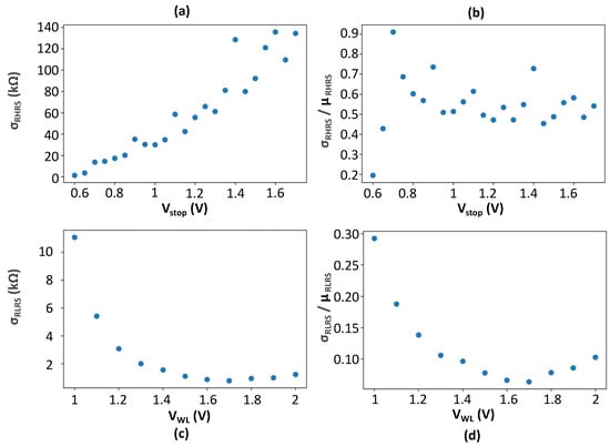 (a) HRS standard deviation versus Vstop voltage steps and (b) σ/μ ratio variation versus Vstop. (c) LRS Standard deviation versus VWL voltage steps and (d) σ/μ ratio variation versus VWL.