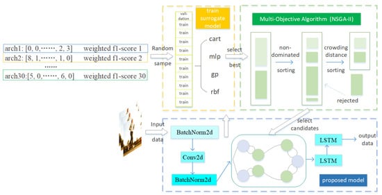 In order to construct the surrogate model, we first randomly sample 30 alternative models and obtain the weighted f1-score of these candidates by thoroughly training on the dataset in the initial layer. Then, we encode these candidate models into integers as the input features, and weighted f1-score, FLOPs, and PaNo serve as labels while training surrogate models in the pre-select layer. After that, the surrogate model with the best cross-validation result is obtained. Next, in each iteration, 20 new individuals are generated through genetics, crossover, and mutation. The surrogate model infers the weighted f1-scores of these 20 individuals and selects the top eight of them as the new individuals of the population in the optimization layer. Then, these new individuals are evaluated without deviation by the genetic algorithm and are added to the training set of the surrogate model before the next iteration. The surrogate models are reupdated each round with the population iterates. Especially as the number of samples increases and individuals tend to the Pareto plane, the prediction performance of the surrogate model increases. Repeat the above process. We can finally obtain a convergent Pareto plane in the output layer. Then, we can choose to use it in downstream tasks.