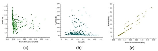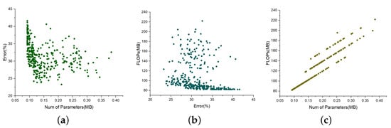 The pairwise relationships of three objectives on dataset OPPORTUNITY. (a) Change relation between number of parameters and error. (b) Change relation between error and FLOPs. (c) Change relation between number of parameters and FLOPs.