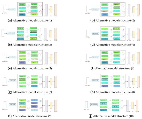 We categorize methods for NAS according to three dimensions: search space, search strategy, and performance evaluation strategy (respectively corresponding to , , and in Table 1). The search space is a set of candidate network architectures. To save time and resources, we permanently reduce the search space with prior knowledge to simplify the search process. The search strategy means the specific method to find the optimal network structure. Performance evaluation strategy refers to the process of estimating the candidate network structure, which aims at discarding the poor candidates and selecting better models. In Table 1, we introduce three types of literature , , and . Refs. [26,30] are about the search space. Refs. [17,21,24,27,28,31,32,33] introduce the research on different search strategies. Refs. [17,22,29,34] are some innovate performance evaluation strategies.