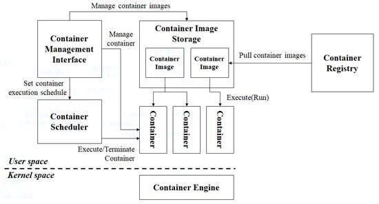 The container engine provides an isolated environment for the execution of containers [23]. A container image is a deployment unit that remains static prior to container execution [24]. A container registry is a server on which container images are registered, and the container management interface serves as a user management interface for the execution and monitoring of containers [25]. The container storage is a repository for container images [26]. Finally, the scheduler handles periodic executions of the container [27].