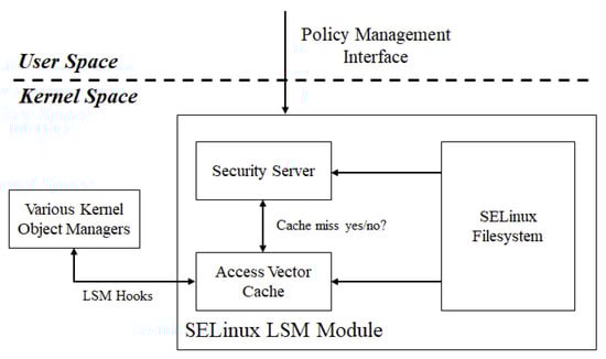 Figure 2 depicts the four-tier structure of SELinux, which is a representative SecureOS architecture. SELinux is based on an access control policy in which the user sets the policy identification number (ID) (object), including the user ID (subject), via the policy management interface, which is then transferred to the Security Server and converted into an object file/directory path by searching the SELinux Filesystem. If the Security Server determines the object file/directory to be complete, the user ID and file/directory path (object) are registered in the Access Vector Cache (AVC). Whenever a file access event occurs, the corresponding event information is transferred to AVC, which extracts the user ID and file/directory path accessing the object. If a user’s file access event matches the access control policy, user access is denied, and the event is logged. Both AppArmor and GPO provide kernel-based file access control, and their structures are similar to that of SELinux [41].