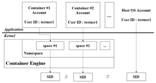 The accessing subject is the user account (user ID) or the user group account (group ID) of the host OS. Therefore, legacy access control techniques adopt the user account as the subject of the access control policy. However, this practice cannot be adopted in a container platform system because of its isolated nature. Figure 3 indicates that the same user account may exist both in the host OS as well as the container on a container platform [48]. The container platform internally uses the namespace technique, which ensures the independence of user accounts and files/directories in the container. Although the user accounts in the host OS and container have identical user IDs, the container platform is processed as a different account by namespace. Namespace separates user IDs into session IDs (SIDs) and independently processes each SID. This isolation feature is the most significant advantage of container platforms. However, access control suffers from specific disadvantages in this case. As mentioned above, an identifier is required to be used as the subject of the file in the container’s access control policy because of the non-uniqueness of the user account.
