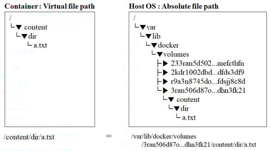 Legacy file access control techniques, such as SELinux, AppArmor, and GPO, use the absolute path to the requested file as the object. However, it cannot be used as an object in container platforms. Figure 4 illustrates the difference between a file path (virtual file path, Vf) known to the accessing user and a real path (absolute file path, Af) [49]. This difference can be attributed to the namespace of the container platform. Therefore, the object of the access control policy must be a real path for the access control policy to be valid with respect to container files [50].