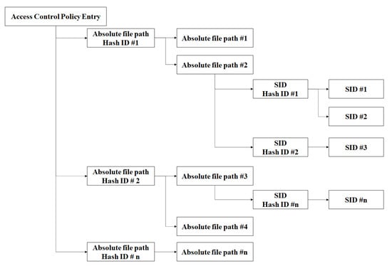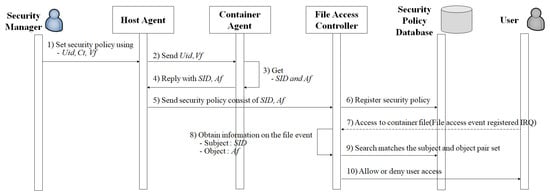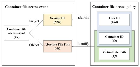 In this study, the container ID (Ct) was used as an additional identifier to facilitate the identification of files in the user container. Figure 5 illustrates the structure of the access control policy used to identify the access events associated with container files.