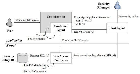 The proposed access control architecture for container files comprises the following three components. The Host Agent serves as the interface of the Security Manager that selects the access control policy. The Container Agent denotes a daemon that converts the access control policy elements to actual information. The File Access Controller monitors user access to the container files and enforces access control policies.