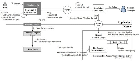Considering the specific characteristics of the container platform, we propose a container file access control architecture, whose schematic is shown in Figure 6.