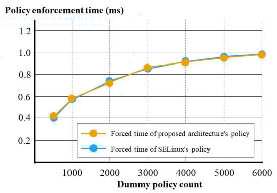 To minimize the enforcement time of the container file-access control policy, we measured the final policy enforcement times when multiple access control policies were registered in the Policy List simultaneously. A dummy policy is a policy that is not actually used and only serves to delay the final policy enforcement time. In this experiment, it was generated by a script created for performance measurement by combining a random Vf, a random container ID, and a random Uid. The measured policy enforcement time of the proposed architecture was compared with that of SELinux to evaluate the performance of the former.