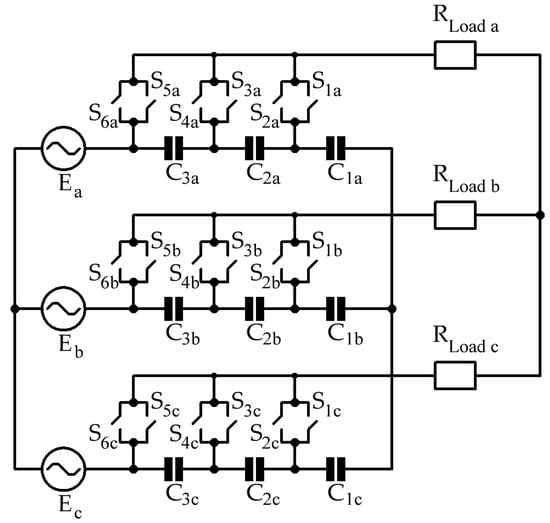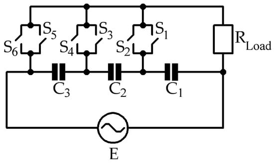 A single-phase electrical circuit of a three-zone converter in Figure 1 structurally consists of the following elements: sinusoidal mains voltage (E), capacitor voltage dividers (C1, C2 and C3), active load (RLoad) and semiconductor elements (S1–S6), which together allow with a MPCS to set and implement the required level of output voltage.
