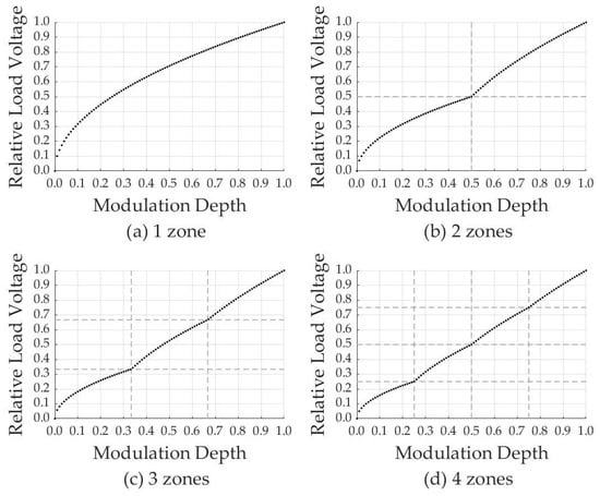 All characteristics are monotonically increasing dependences on the modulation depth and also have key points (1/2 for two-zone, 1/3 and 2/3 for three-zone, 1/4, 2/4 and 3/4 for four-zone). The first aspect is explained by increasing the output voltage of the converter using a pulse width modulation (PWM) control system. The second aspect is characterized by the opening of the zones and the connection of the divided mains voltage between the capacitors to the load. An increase in the number of transducer zones makes it possible to obtain a more linear nature of the control characteristics due to an increase in the number of key points and, therefore, simplifies the development of an MPCS. However, an increase in the number of semiconductor switches entails an increase in power losses for switching with a decrease in efficiency.
