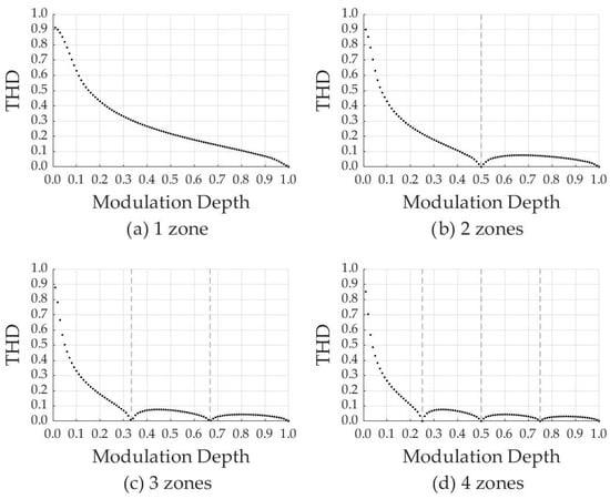 With the full opening of each zone (at key points), the shape of the output voltage corresponds to an ideal sinusoidal signal, which means that when decomposed into a spectrum, harmonics other than the main one do not have. What does the zero contribution of higher harmonics mean in the calculation of the total harmonic distortion (THD) in Figure 5. Since the modulation depth affects the output voltage shape, when the signal is decomposed into a spectral composition, the quality of the load voltage will also change. An increase in the number of zones will also have a positive effect on the quality of the signal since there will be more key points, and the higher harmonics will make a smaller contribution. The multi-zone structure of the AC voltage converter also allows for increasing the voltage range of use and connection of consumer devices to high-voltage networks without harm to semiconductor switches. In the following, the structure of a multi-zone RAV with three zones will be considered.