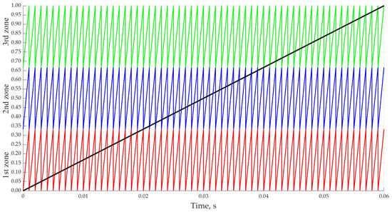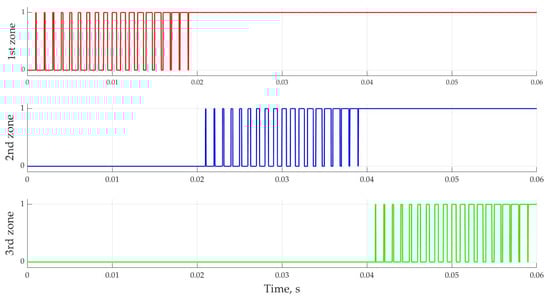 For a visualization of the control system operation principles, work on the formation of control impulses in dynamics will be considered, i.e., with a linear increase in the modulating signal (modulation depth M) in Figure 6. The duration of the opening of each zone corresponds to one period of the main voltage (20 ms).