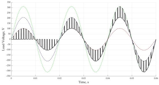 Sequential opening of zones by increasing the depth of modulation contributes to a change in shape in Figure 8 and an increase in the effective value of the load voltage. After the opening of the first zone (M > 1/3), the voltage across the capacitor C1 is applied to the load (in red). After opening the second zone (M > 2/3), the voltage across the capacitor C2 is applied to the load (in blue). After opening the third zone (M = 1), the voltage on the capacitor C3 is also supplied to the load (in green). It is possible to control the converter not according to the principle of the sequential opening of zones. In this case, using the example of opening the second zone, it is possible to obtain not from 1/3 to 2/3 of the mains voltage but from 0 to 2/3.