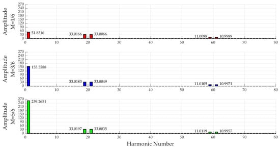 The fundamental harmonic of the load voltage should make the main contribution to the spectral composition when using the FT. With an increase in the switching frequency, it is possible to achieve an increase in its multiplicity with the frequency of the supply voltage, which means moving the minor switching harmonics away from the initial main one, thereby reducing their impact on quality. According to the FT, when decomposing the signal under study into harmonic components with increasing frequency, there should be a tendency to decrease the amplitudes of higher harmonics according to the Dirichlet principle.