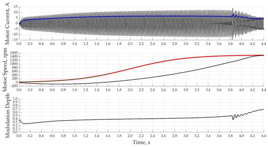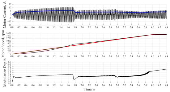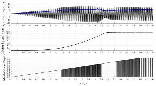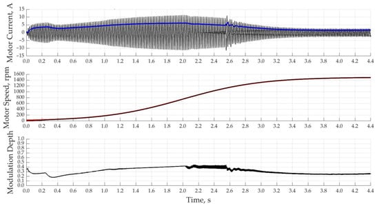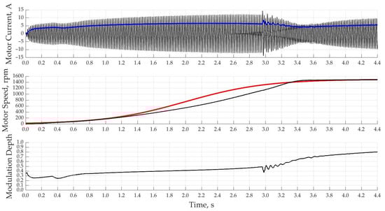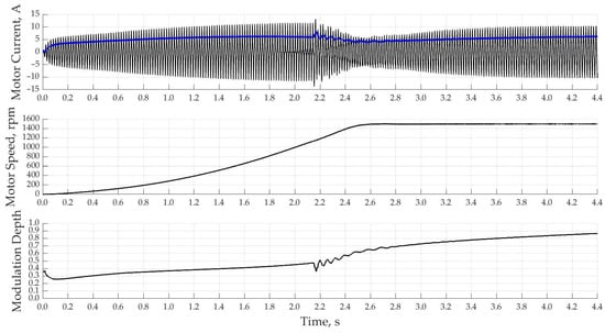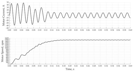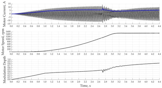 When using a PI-controller with a single-loop system of automatic control of the motor current with a rated current according to the setting, the acceleration of the motor starts much faster and reaches the rated speed already in 2.5 s in Figure 13. This control method is characterized by overcurrent at speeds close to the nominal ones due to the fact that the regulator itself has a delay time to regulate the magnitude of the output voltage connected to the motor.