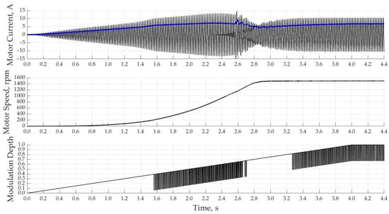 The harm from a fivefold excess of the rated value motor starting current was described earlier. In order to solve this problem, it was decided to use the principle of a smooth increase in power when starting the motor. A dynamic increase in the modulation depth should, by means of regulation by a multi-zone AC voltage converter, reduce the magnitude of the starting currents. To ensure that the starting current is limited, the motor current feedback in the relay controller is used. The principle of operation is based on the disconnection of all zones (M = 0) in case of exceeding the rated effective value of the motor current in Figure 11. The principle of operation of such a relay controller is based on logical operations and is quite simple in software implementation in practice. The acceleration duration was set to 4 s, and the motor reached its nominal speed already 3 s after the start, but the main significant acceleration began after 1 s. The blue color indicates the root mean square (RMS) value of the motor current.