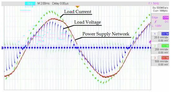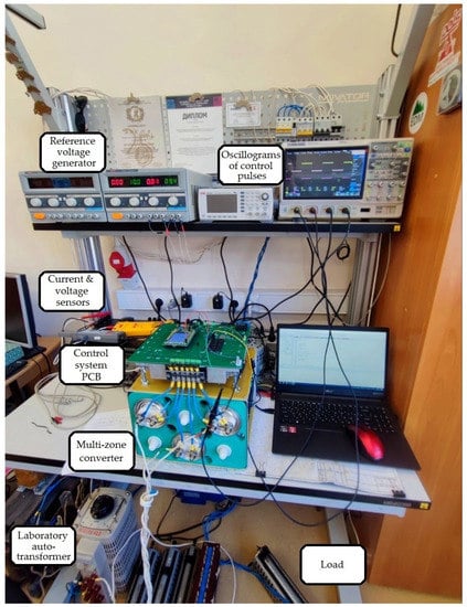 To check the correct operation of the multi-zone AC voltage converter in practice, an experimental stand was implemented in Figure 20. At this stage of the study, not an induction motor but an active load was used as a load. The formation of control pulses is based on information about the sign of the mains voltage, which means that in order to implement the NSU, it is necessary to connect a step-down transformer, the output voltage of which is supplied to the OA board. A current sensor was used to obtain current load data, and a voltage sensor was used to obtain the mains voltage sign. The formation of the reference voltage generator was implemented in the MPCS. The mains voltage was connected to the converter through a control autotransformer.