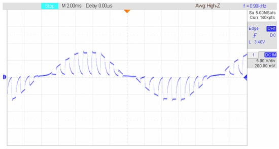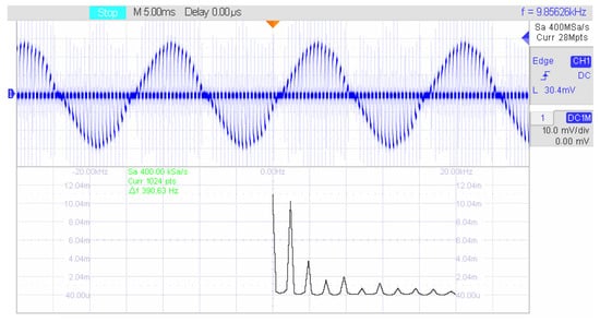 At a switching frequency of 1 kHz, the multiplicity with a supply voltage frequency of 50 Hz will be equal to 20. Accordingly, the influence of non-fundamental harmonics will be greatest at odd frequencies near multiples of 20 (19 and 21). Moreover, switching harmonics are characteristic only for odd multiplicity (1–20, 2–60, 3–100, etc.), as shown in Figure 9.