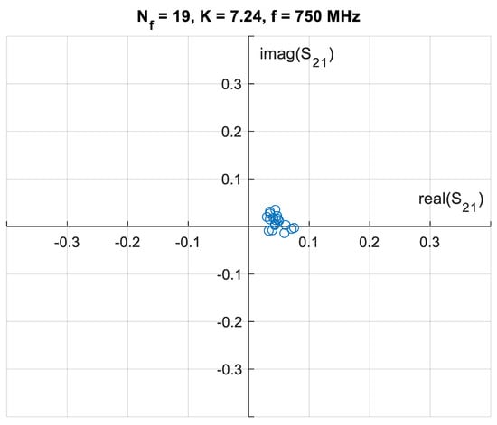 Scatter plot of relative at the subset of 19 electromagnetic field realizations simulated at 750 MHz. The corresponding value of the Rician K-factor is 7.24.