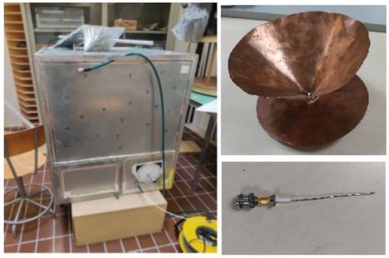The MMSS RC used is shown in Figure 6. It is possible to note the holes used to insert the feeding monopoles each time. The figure also shows the transmitting 100 mm monopole and the receiving discone antenna: both antennas were designed and built in our laboratories.
