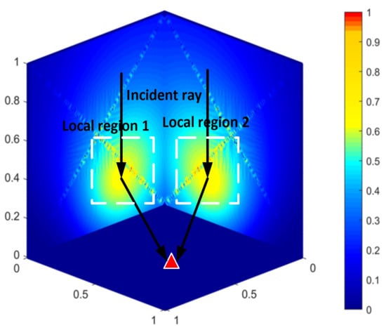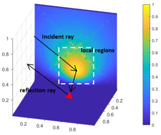 As shown in Figure 3 and Figure 4, a triangular surface element (red triangle) on the model is selected for study. The colors on the graph indicate the normalized coupling intensity of the other triangles to the red triangle. On the ray tracing path, the surface elements in the local region contribute the most to the red triangle. The influence outside the local area gradually decreases. Thus, the iteration area of the red triangle can be restricted from the whole target area to a small local area. For the dihedral angle, there is only one local region on the ray path with a large coupling effect on the red triangle, while for the trihedral angle, there are two local regions at an incident angle of . Thus, the dihedral angle needs only one iteration to reach convergence, while the trihedral angle needs two iterations. Considering the balance between efficiency and accuracy, the local region is set between 15 wavelengths and 20 wavelengths. It is important to note that surface elements that are not on the bouncing path are not processed by this method, i.e., processed with the IPO.