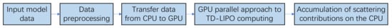 Parallel computation of the TD-LIPO method can be understood as parallelism of the target surface elements. As shown in Figure 5, the model data are first read and pre-processed by the CPU module. Preprocessing is performed for each individual surface element, including discrimination of bright and shadow areas. At the same time, the solution of the reflective surface element is preprocessed. Then, the local coupling iterative solution of the surface elements is performed on the GPU. Finally, the scattering contributions of all surface elements are accumulated using the CPU module.