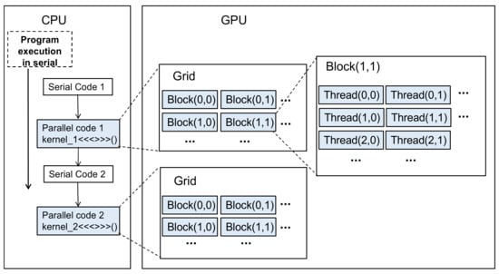 In the CUDA programming model, the CPU is called the host and the GPU is called the device. The device-side code is mainly used to perform parallel computing tasks. As shown in Figure 6, each parallel code is called a kernel function, and each kernel function specifies a computational task. The kernel function is divided into three levels of parallelism: thread grid, thread block and thread. The maximum number of thread blocks allowed in each grid is 65,535. Each thread block contains multiple threads. Meanwhile, each thread and thread block has its own index.