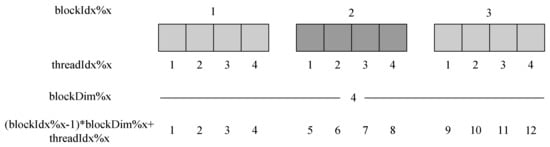 In the Fortran program, the threads in the X-domain are marked by , where is the number of the thread blocks and is the number of the threads. Moreover, is the total number of threads in each thread block. As shown in Figure 7, the kernel function starts a thread grid containing three thread blocks and each thread block has four threads.
