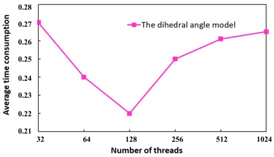 The GPU used in this article is the NVIDIA GTX1080Ti. This GPU supports a maximum number of thread blocks per dimension of 1024, and the maximum number of threads that can fit within each thread block is also 1024. For the dihedral angle model of Section 3.2, Figure 8 counts the average computation time for different number of threads set in the block. The average computation time is the result of multiple statistics of the total time the program runs divided by the total number of samples. The average computation time is shortest when the number of threads is 128. At this time, the program has the highest computational efficiency.