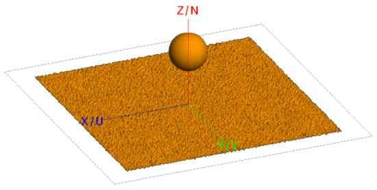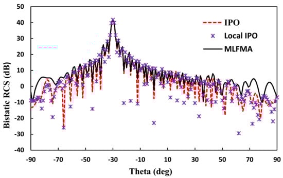 Figure 10 shows a composite model of the rough surface and the ball, which are both ideal conductors. The size of the rough surface is 1.8 m × 1.8 m, the radius of the sphere is 0.15 m and the distance from the rough surface is 0.3 m. The unknown number is 132,816, the frequency is 4 GHz, the incident angle is , the observation angle is and the polarization is vertical. The number of iterations for IPO and Local IPO is two. The size of the local region is 15 wavelengths in Local IPO. is the root mean square error: