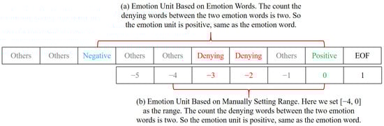 Emotion word processing with emotion words as the statistical interval of emotion words is possible. Identify the emotion words in the word segmentation results, and count the number of denying words including rhetorical questions between the current emotion word and the previous emotion word (if the current emotion word is the first emotion word that appears, count the number of denying words that appear in all the word segmentation units before the word). A calculation example is shown in description (a) of Figure 1.