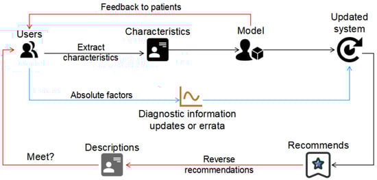 Recommendation systems estimate users’ preferences for items and actively recommend items that users may like [7]. Recommendation models are typically divided into three categories: collaborative filtering [8,9,10,11], content-based [12,13,14], and hybrid recommendation systems [15,16]. Collaborative filtering makes recommendations by learning the users’ item history interactions (either explicitly like a patient’s previous reviews or implicitly like a diagnosis history).