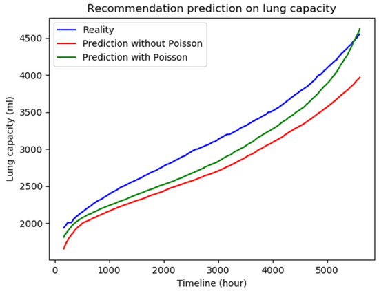 Figure 3 shows the reality and the prediction on lung capacity, where the red curve stands for prediction without Poisson, whereas the green curve stands for that with Poisson. In the natural environment, the student works better than both the two prediction results. Thus, there is a conceptual drift in this sample. Prediction with Poisson has fixed its prediction to a better lung capacity, proving to be a better recommendation system. We use R2, shown as Equation (6), to evaluate, where SST means sum of squares total, SSR means sum of squares regression, and SSE means sum of squares error. Prediction without Poisson is 0.7186, whereas prediction with Poisson is 0.9178. The R2 increased by about 27.72%.
