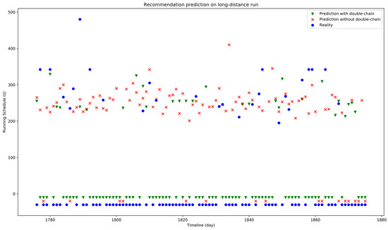 Figure 4 shows the recommendations and predictions of realistic and with or without dual-chain recommendation systems for long-distance running. It is important to note that a negative value indicates no running or recommending rest on that day. To avoid too many points overlapping in a straight line, we used three negative values, different from each other, to separate rest days in the three cases. As is shown in Figure 4, the studied college student failed to train for long-distance running precisely as the recommendation systems advised. According to the plan, there were a few days when he should have trained, but he did not.