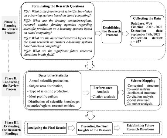 To apply the bibliometric analysis, a protocol is required to allow researchers to anticipate problems, avoid arbitrary judgments, uphold study integrity, and increase responsibility [69]. Various protocols and research frameworks that can be applied in the bibliometric analysis are presented in the literature: bibliometric analysis toolbox [70], bibliometric protocol [60,71,72], and research design of bibliometric analysis [73,74,75,76]. The bibliometric protocol of the present research is adapted by the authors after analyzing the information from the above-mentioned sources and developing the specified frames to the objectives of the current study (Figure 3).