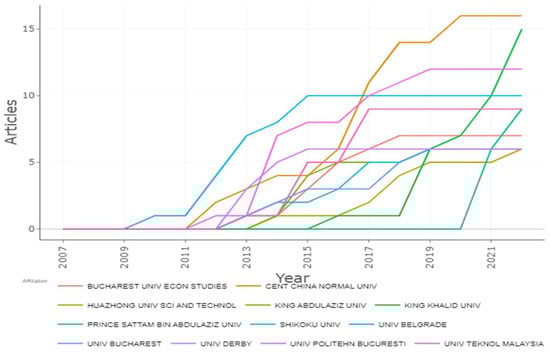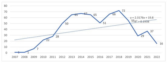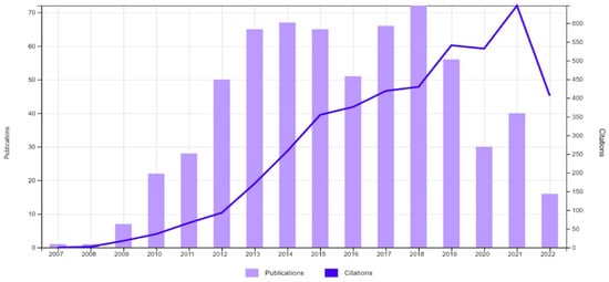 The next step represented a keyword search in WoS using the keywords: “e-learning” AND “cloud computing” in the “All fields” section of the database. The search took place on 19 September 2022 and 638 documents were generated. One document was an early access article with the publication year 2023 and it was eliminated from the list, as the year 2023 has not started yet and no other indicators are available. Thus, the database consists of 637 documents, published between 2007 and 2022.
