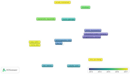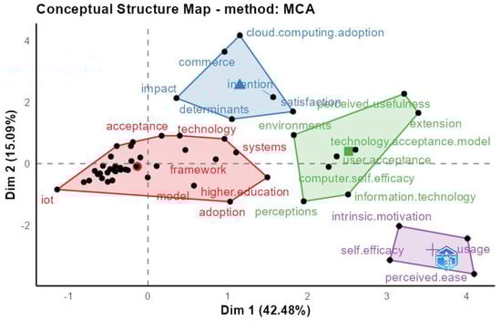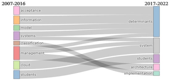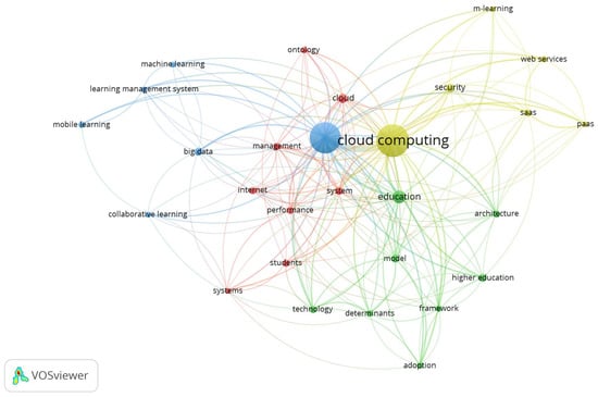 To present an answer to research question number 1 (RQ1), a rapid increase in the volume of research on e-learning systems based on cloud computing during the period 2009–2014 (Figure 4) has been observed. After this date, the evolution of scientific production in the analyzed topic experienced significant fluctuations. In 2020, the number of publications decreased. This coincided with the onset of the global COVID-19 pandemic, which led to the imposition of restrictions on access to the traditional education system and its replacement with online learning. Thus, research in the field has mainly focused on online learning which has gained much attention, while the term e-learning has been included less and less as a keyword in publications over the last three years.