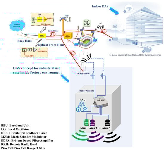 Block diagram showing a backhaul, the baseband unit (BBU) connected to an optical front haul (OFH). The base station connects the remote radio heads (RRHs), the distributed antenna system for industrial and indoor factory use case is also shown where RoF as an OFH is connected to the RRH and then DAS via source donor and receive antennas is integrated with hub unit for wireless connectivity.