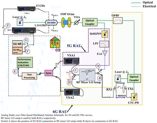 The RF coupler mixed the two generated waves, which were then introduced into a dual-drive Mach-Zehnder modulator (Thor Labs LNP4216) operating at 1310 nm. The combined RF signal power was set at approximately 10 dBm. The optical link consists of a single-mode fibre (SMF) with a length of 10 km, followed by the variable optical attenuator (VOA) that incorporates the optical coupler to achieve the cascade architecture []. Instead of using an optical coupler, a Diplexer (DPX) could also be used as DPX has an additional advantage in that it is frequency selective and will divide the signals accordingly. The optical wave was then divided into two separate routes, one towards the 5G remote antenna unit and one towards the 6G-RAU.