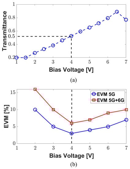 (a) MZM measured transmission power in the optical domain concerning bias voltage and (b) EVM with and without 6G signal for varying bias voltages.