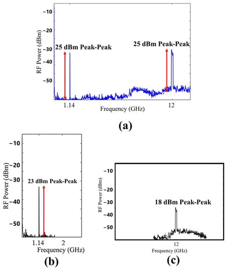 Additionally, multichannel aggregations enable the RoF to support many signals from the same or separate providers at once []. More specifically, utilizing RF circuits or digital signal processing (DSP), various mobile data are converted onto an intermediate frequency (IF) carrier; as a result, many signals are transported simultaneously on a single optical carrier. Therefore, the RoF transmission link makes it possible for the DAS network, which may have different architectural configurations, to distribute these multiple signals flexibly.