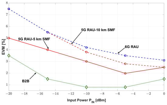 EVM vs. RF input power for 5G (B2B, 5 km and 10 km SMF length) and 6G signals at respective RAUs.