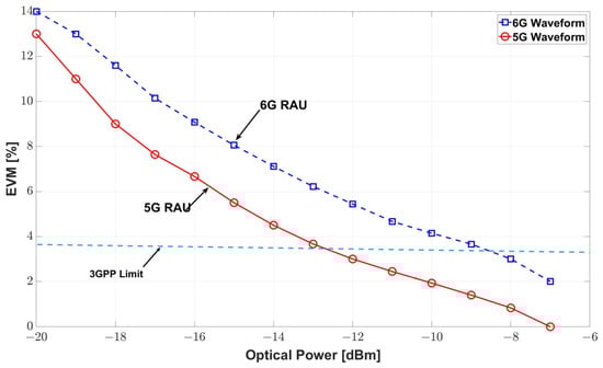 EVM vs. optical power for 5G and 6G signals at respective RAUs.
